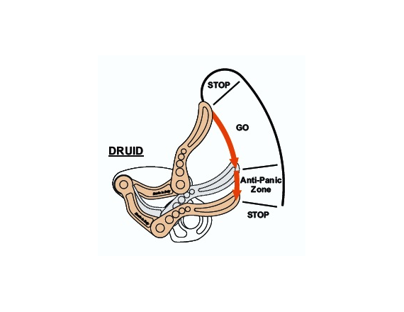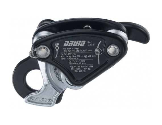 Легкое и компактное автоматическое спусковое устройство черного цвета для работ методом веревочного доступа, тактических и спасательных операций. Разработано для использования с веревками диаметром от 10 до 11 мм. Патентованная система "антипаник" заблокирует эксцентрик в случае слишком сильного нажатия на регулировочный рычаг, тем самым препятствуя неконтролируемому спуску с небезопасной скоростью. Корпус и ручка изготовлены из прочного алюминиевого сплава. Механизм эксцентрика выполнен из высококачественной нержавеющей стали. Запатентованная конструкция механизма позволяет добиться черезвычайно плавного скольжения веревки в учтройстве, что в свою очередь снижает скорость износа веревки и гасит небольшие рывки, возникающие при работе. Плавность протравливания веревки также позволяет использовать DRUID в качестве зажима для подъема по веревке. Эксцентрик может быть освобожден из положения блокировки при помощи ручки как под нагрузкой, так и без нее. На корпусе устройства расположена стальная проушина для крепления предохранительной самостраховки.