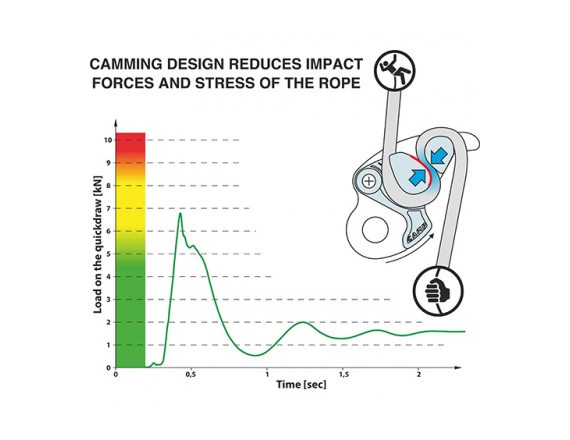 • Постепенное действие эксцентрика уменьшает силу удара в случае падения и снижает износ верёвки
