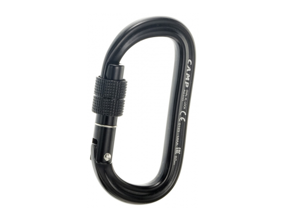 Овальный карабин черного цвета c завинчивающейся муфтой, специально разработанный для использования с механическими устройствами и роликами. Увеличенный размер, широкое раскрытие и большая разрывная нагрузка.